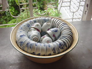 Another thing which fascinates me is the way small tea cups (placed on the altar) are arranged to dry after washing. I like the way the cups form a ring round the ones in the centre!